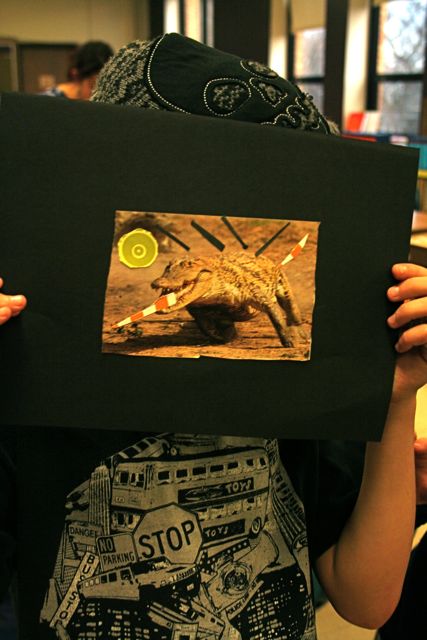 A few weeks ago, Nina photographed our Friday students while playing outside. The printed photographs were given to each student to create a collage, where they became the main character or supporting character and in a style that references motion graphics often used in comic strips (see the example Nina created and is holding against the white board below). Students who were absent the day photographs were taken had the option to use photos of their classmates or to select imagery from our stash of National Geographics. Some students chose to use both. The results are exciting, imaginative and bold! Do take a look below!
