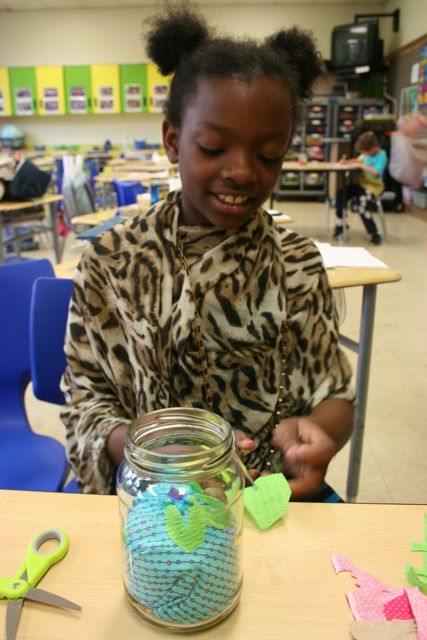 This is one of those really fun projects using items from around the home and yard to create a magical little world, ripe with stories to be told. Inspired by Emily Neuburger's "Storytelling Jars" from her super creative book "Show Me a Story", students used colorful scrap fabric and paper, sticks, tiny magazine images, odd beads and tiny stones to assemble a little scene within the jar. Items can be taken out and re-arranged or new items can be added to set the stage for new stories to be told. Parents: this is a perfect rainy day activity to chase the doldrums away!